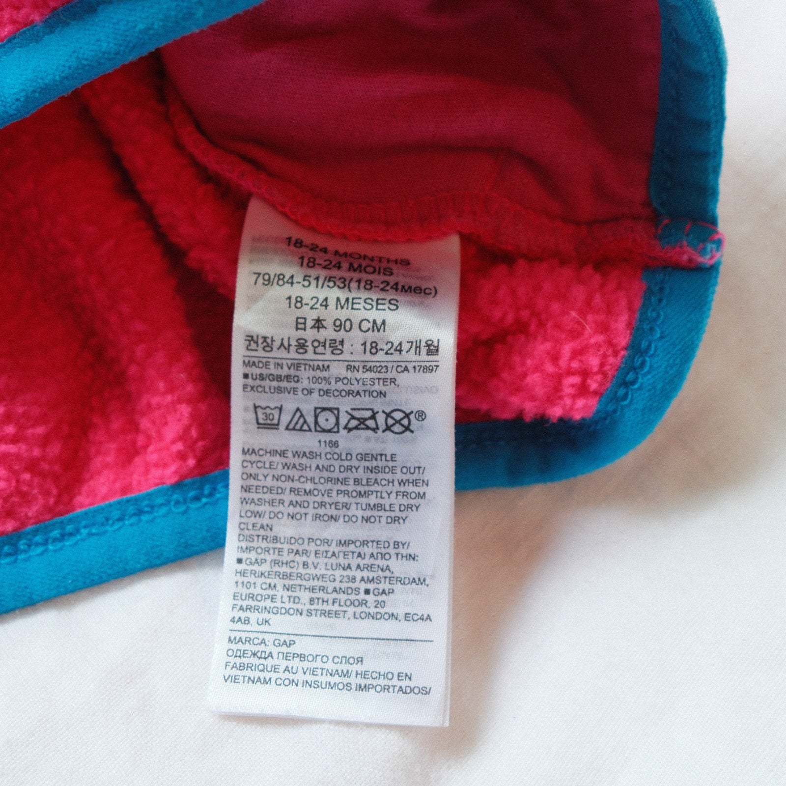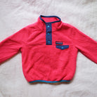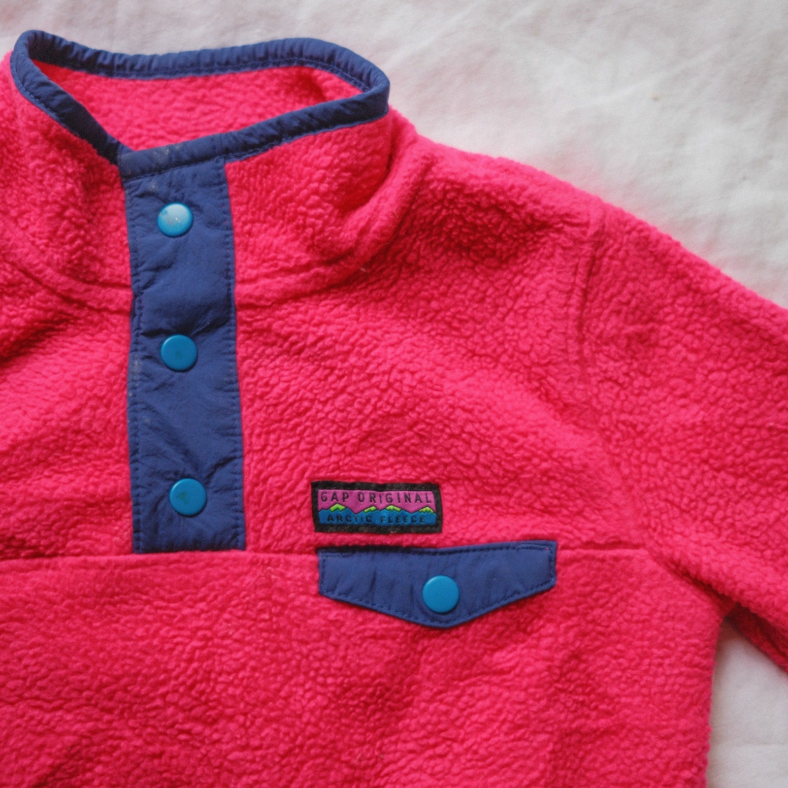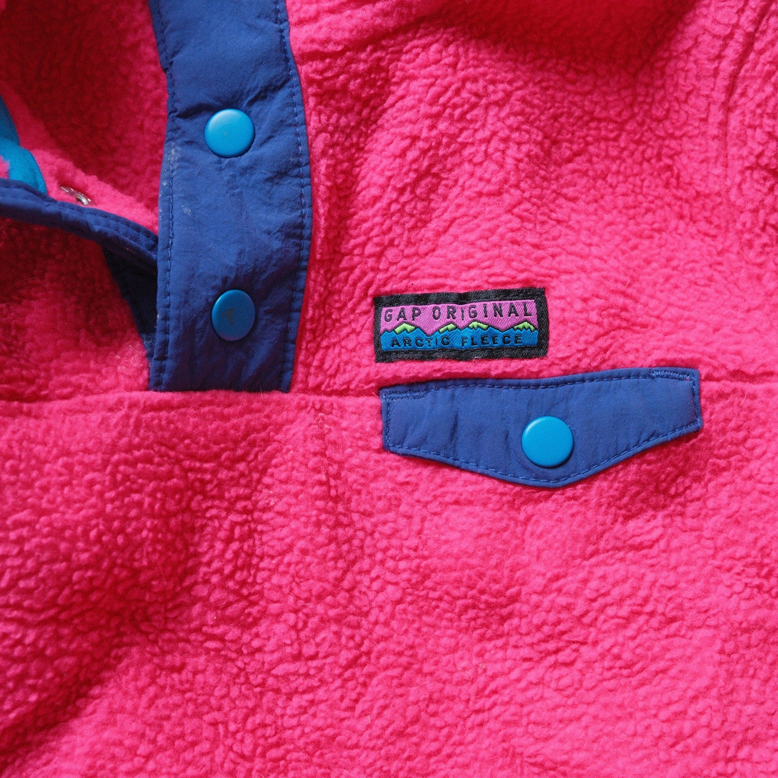 A bright and cozy toddler fleece from GAP’s Arctic Fleece Reissue line. This snap-front pullover features a bold pink fleece body with contrasting blue trim, snap buttons, and a chest pocket. Warm yet lightweight, it’s perfect for layering on cool days and adds a fun retro-inspired look to any outfit.